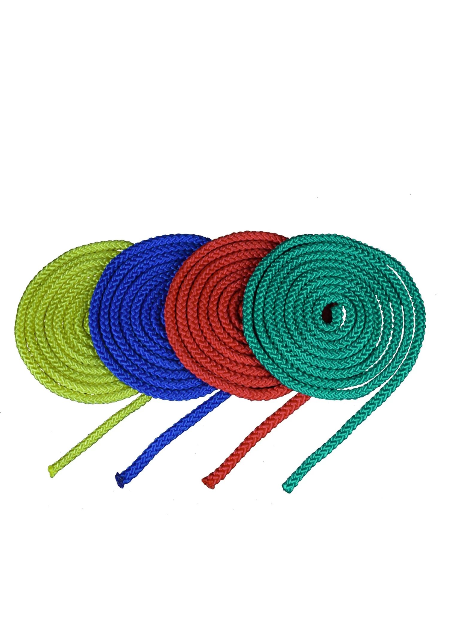 Lot de 4 cordes à sauter d’initiation (1 rouge, 1 bleue, 1 jaune, 1 verte) en nylon de diamètre 8mm et de longueur 2.5m. Disponible en 3 tailles : 2m (ref 044093), 2.5m (ref 044056) et 3m (ref 044095)