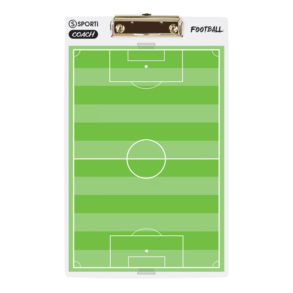 Planche effaçable rigide en PVC avec pince métallique, une face avec terrain en entier et une face avec un demi terrain. Livré avec un marqueur. + Produit : demi-terrain avec vue immersive au verso, livré sous packaging individuel facile à mettre en rayon. L22,5cm x 36cm.