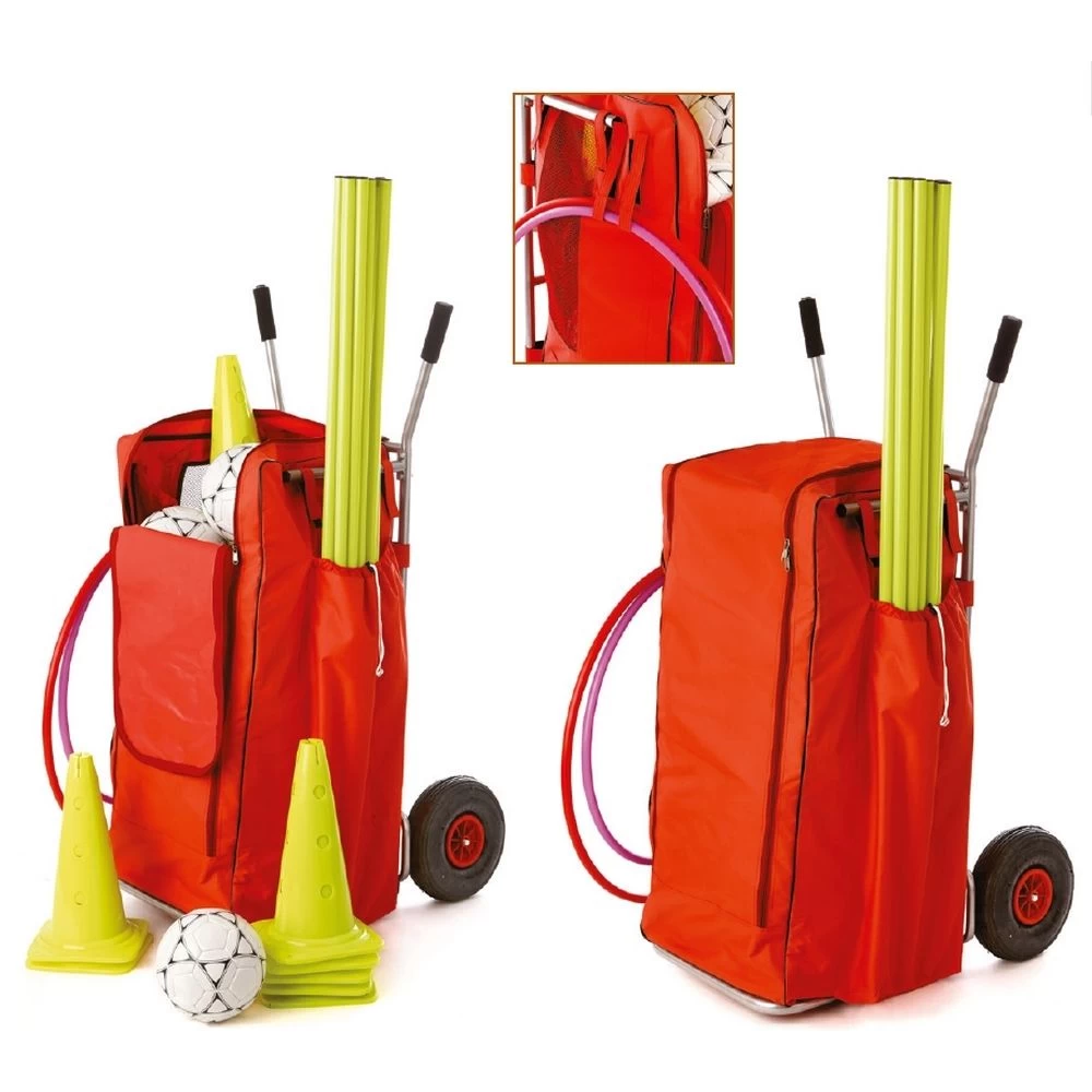 Chariot diable avec roues gonflables muni d’un sac compartimenté et avec attaches velcro permettant de transporter tout le matériel sur le terrain.